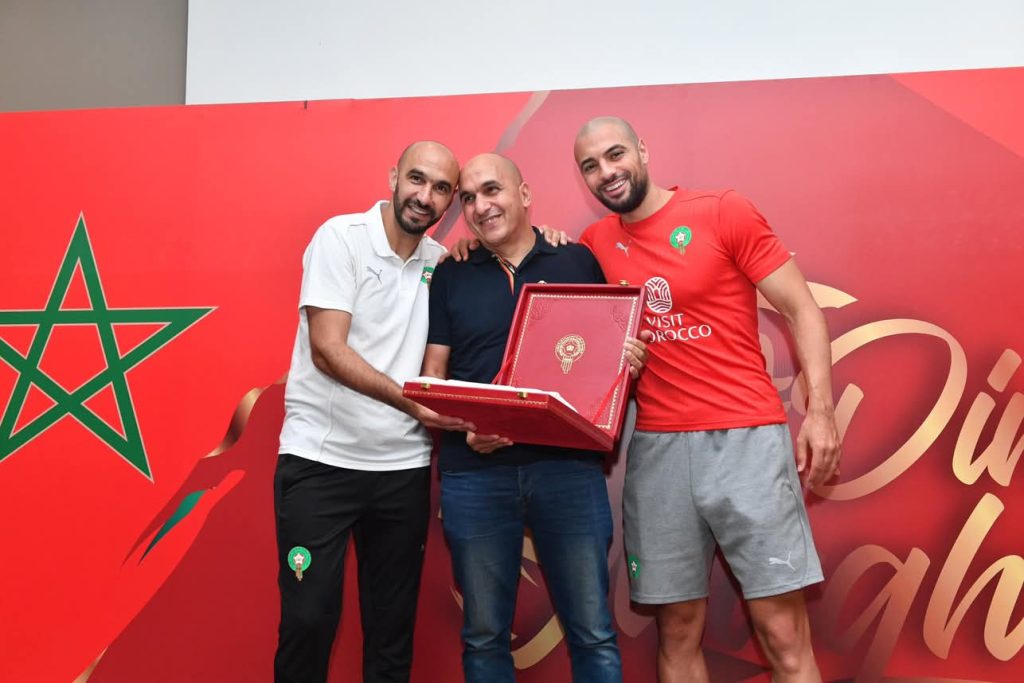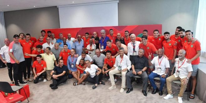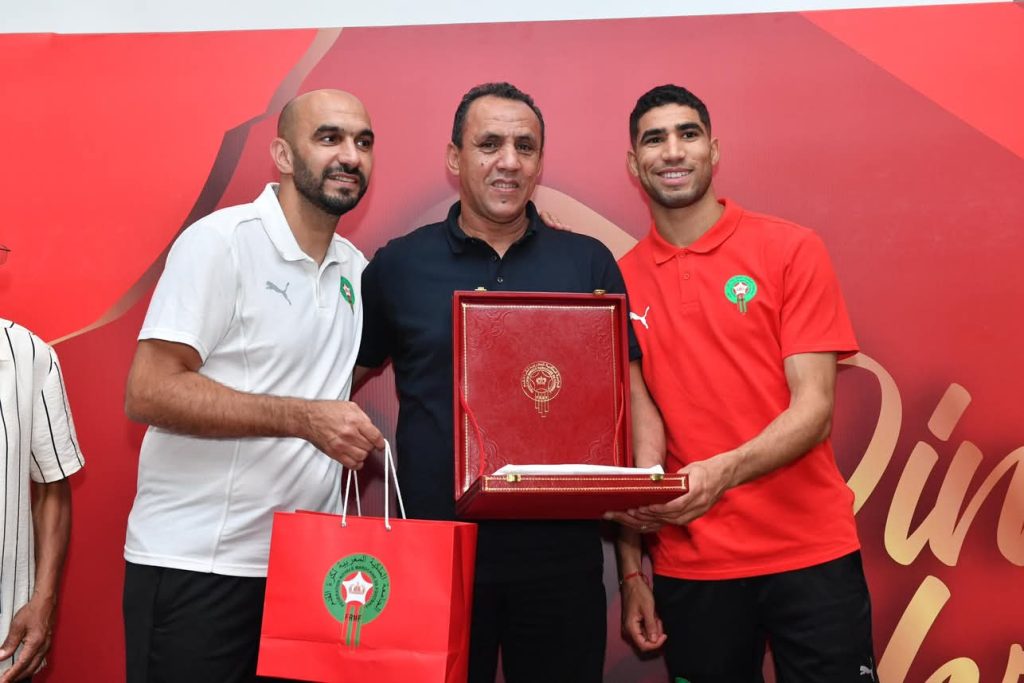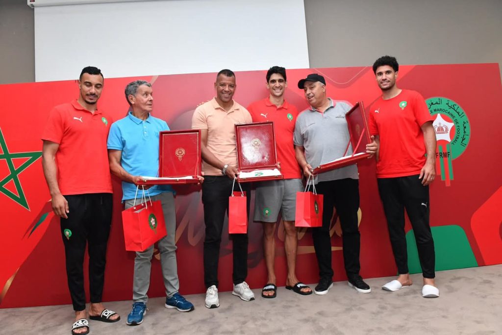 أقامت الجامعة الملكية المغربية لكرة القدم اليوم الاحد 8يونيو2025 ، حفل استقبال على شرف اللاعبين الدوليين السابقين الذين حملوا قميص النخبة الوطنية في فترات مختلفة ، وشاركوا في المسابقات القارية والدولية ،وذلك على هامش استضافة مدينة فاس للمباراتين الوديتين للمنتخب الوطني المغربي امام كل من تونس وبنين، والذين تالقوا أيضا ضمن صفوف فريقي النادي المكناسي والمغرب الفاسي.هذا الحفل ،حسب ما نقلته الجامعة الملكية المغربية لكرة القدم عبر موقعها الرسمي ،اقيم في مقر إقامة المنتخب الوطني بمدينة فاس، حيث تتواصل استعدادات العناصر الوطنية للمباراة الودية التي ستجمعهم بالمنتخب البنيني يوم غد الإثنين 9 يونيو2025، على أرضية المركب الرياضي لفاس.وقد شكّل هذا اللقاء فرصة لتكريم مسار عدد من الأسماء التي بصمت على حضور قوي في تاريخ الكرة المغربية، كما فتح المجال أمام تفاعل ودي بين الجيل الحالي والجيل السابق، حيث أجرى لاعبو المنتخب الوطني الحاليون حوارات مباشرة وثنائية مع اللاعبين القدامى، تبادلوا خلالها التجارب والرؤى حول مسار اللعبة وتطورها.وتأتي هذه المبادرةحسب نفس البلاغ ، في سياق اهتمام الجامعة الملكية المغربية لكرة القدم بالحفاظ على ذاكرة المنتخب الوطني، وتثمين المساهمات التي قدمها اللاعبون السابقون، من خلال مدّ جسور التواصل بين أجيال مختلفة حملت القميص الوطني بكل تفان.ومن بين اللاعبين الذين تم تكريمهم :