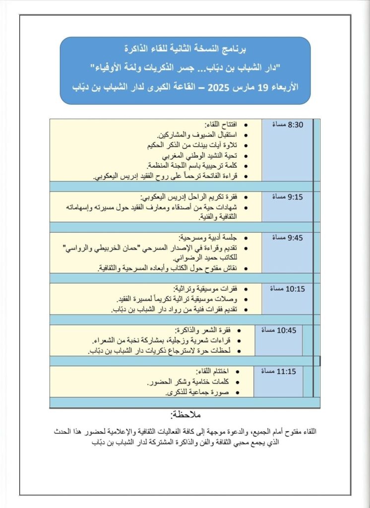 وتأتي هذه النسخة ،حسب المنظمين اصحاب هذه المبادرة ،تكريمًا لروح الراحل با إدريس اليعقوبي، وما ادراكما با ادريس أحد الشخصيات البارزة في المشهد الثقافي والفني بالمدينة. هذا اللقاءيتضمن شهادات في حق الفقيد، وقراءة في الإصدار المسرحي “حمان الخربيطي والرواسي ” للكاتب حميد الرضواني، إضافة إلى فقرات موسيقية وتراثية وقراءات شعرية.