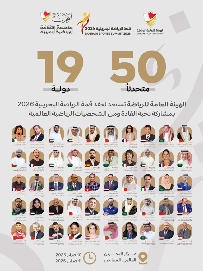 تنطلق فعاليات قمة الرياضة وصناع القرار البحرينية يومي 10 و11 فبراير 2026، في مركز البحرين العالمي للمعارض، ضمن مبادرة البحرين عاصمة الثقافة الرياضية العربية، بمشاركة واسعة تضم 50 متحدثًا من 19 دولة، من القيادات الرياضية وصنّاع القرار والخبراء والمتخصصين في مختلف مجالات العمل الرياضي.