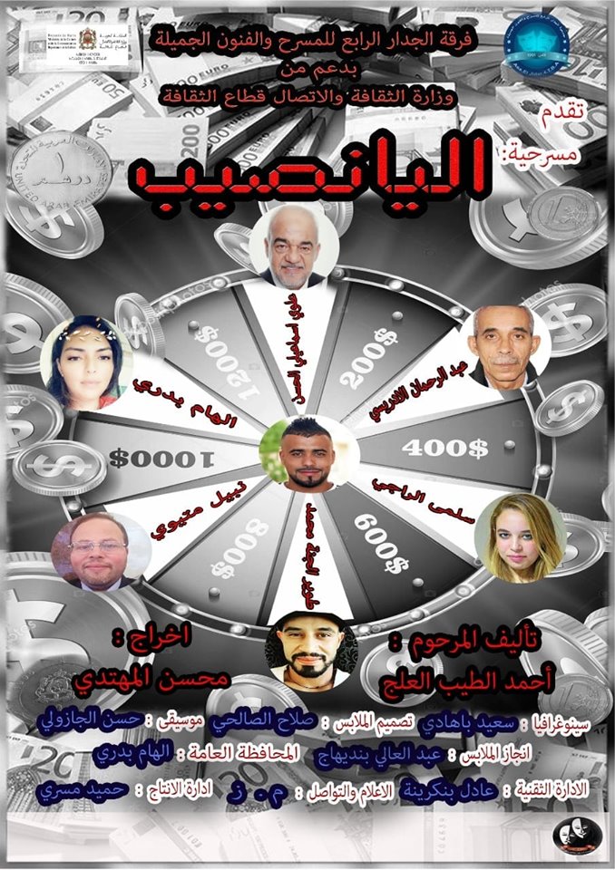 تعرض فرقة الجدار الرابع للمسرح والفنون الجميلة بفاس ، بدعم من وزارة الثقافة والإتصال-قطاع الثقافة، عملها المسرحي الجديد بعنوان “اليانصيب”، تأليف الراحل أحمد الطيب العلج وإخراج محسن مهتدي، يوم الجمعة 13 شتنبر 2019، بالمركب الثقافي الحرية بفاس، على الساعة الثامنة مساء.