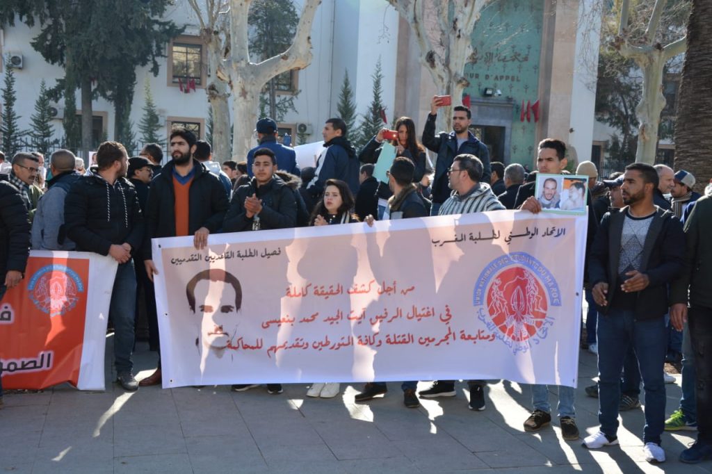 ولعل ذلك كان سببا في غياب قياديي حزب العدالة والتنمية باستثناء رئيس جماعة مكناس،وبعض المناضلين ،فيما احتشد عدد كبير من الطلبة القاعديين ،وممثلي الجمعية المغربية لحقوق الانسان ، وجمعية المعطلين ، امام المحكمة حاملين لافتات و مرددين شعارات تندد بمقتل الطالب ايت الجيد ،خلال الأحداث التي عاشتها جامعة سيدي محمد بن عبد الله بفاس سنة 1993،