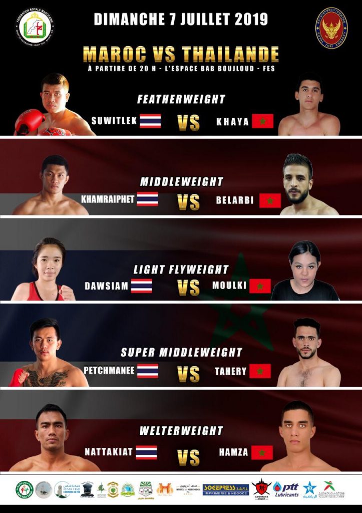 فخلال المباراة الأولى المبرمجة ضمن هذه المنافسة الكبرى والتي ستلعب برسم وزن أقل من 67 كلغ سيواجه المغربي رشيد حمزة منافسه التايلاندي بطل اللومبيني سطاديوم Nattakiat ، بعدها سيدخل المغربي عثمان الطاهري لمنازلة خصمه التايلاندي Petchmaneeضمن مباراة من وزن أقل من 75 كلغ ، ثم سيأتي الدور على المغربية هاجر مولكي المنتمية لعصبة سايس تافيلالت والتي ستتبارى ضمن مباراة خاصة بالإناث أمام منافستها البطلة التايلاندية Dawsiam ، وخلال المباراة الرابعة التي برمجت برسم وزن أقل من 71 كلغ ستكون المواجهة بين المغربي محمد بلعربي المنتمي أيضا لعصبة سايس تافيلالت والتايلاندي Khamraiphet ، لتتختم هذه النسخة بالمباراة الخامسة المبرمجة ضمنها برسم وزن أقل من 52 كلغ بين المغربي أيوب خيا و نظيره التايلاندي Suwitlek .