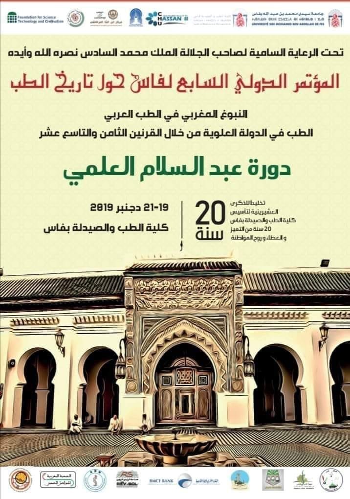 تحت عنوان «النبوغ المغربي في الطب العربي، الطب في الدولة العلوية من خلال القرنين الثامن والتاسع عشر» «دورة عبد السلام العلمي»، وذلك برحاب كلية الطب والصيدلة بفاس طيلة أيام 19/ 20/21 دجنبر 2019.