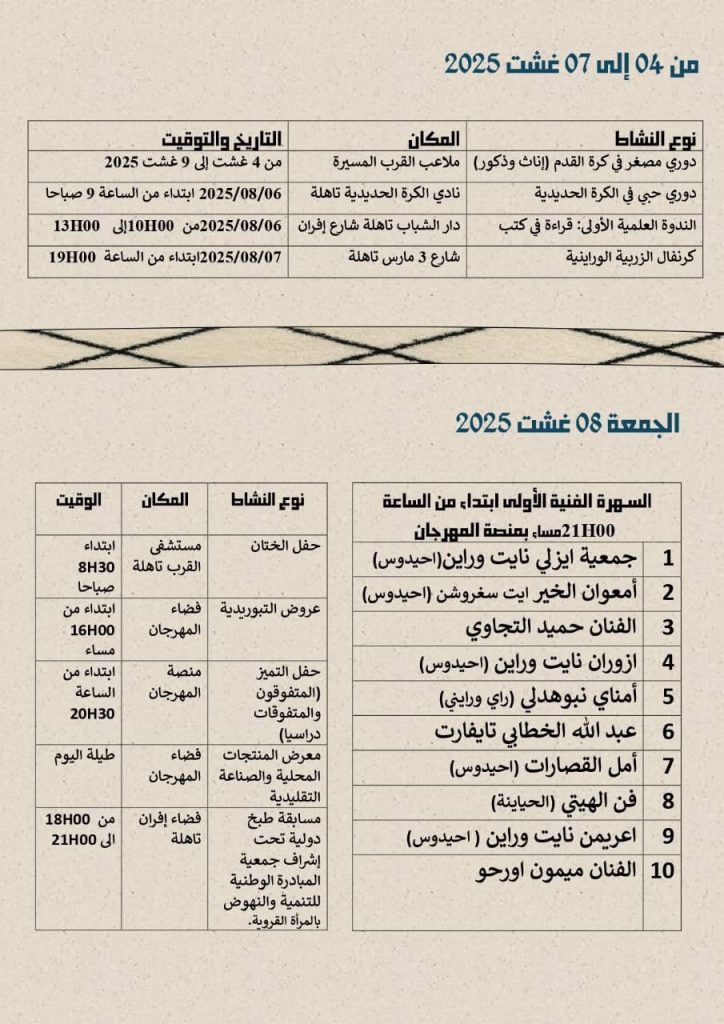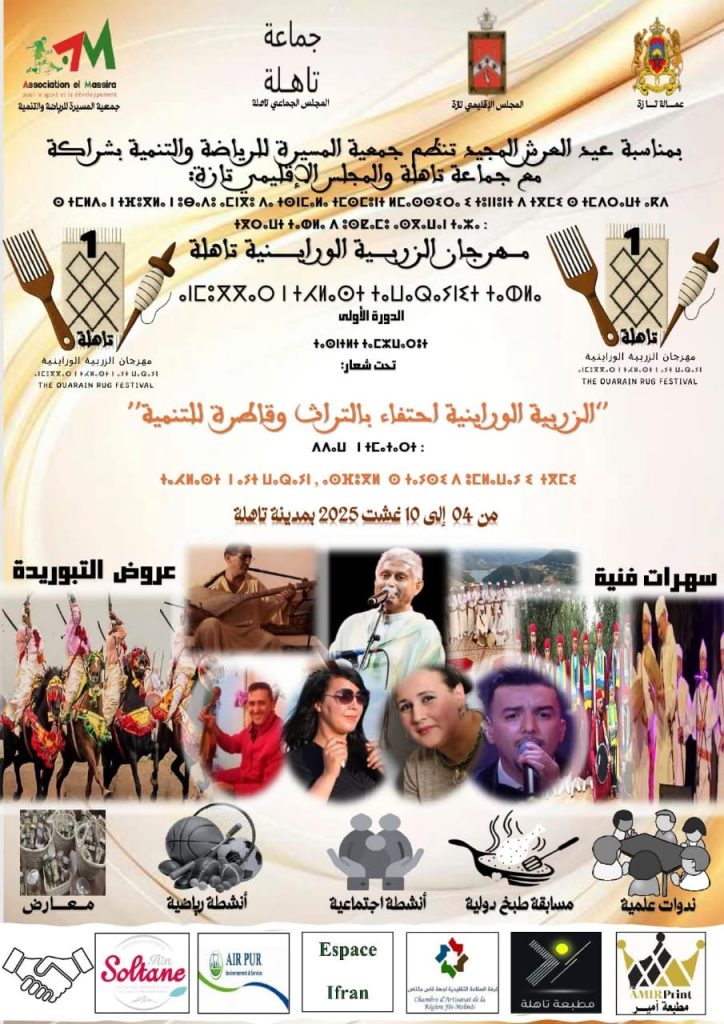 تحت شعار :”الزربية الوراينية احتفاء بالتراث وقاطرة للتنمية المستدامة .”تنظم جمعية المسيرة للرياضة والتنمية ،بشراكة مع جماعة تاهلة والمجلس الإقليمي لتازة ،الدورة الأولى لمهرجان الزربية الوراينية /تاهلة مابين رابع وعاشر غشت الجاري .