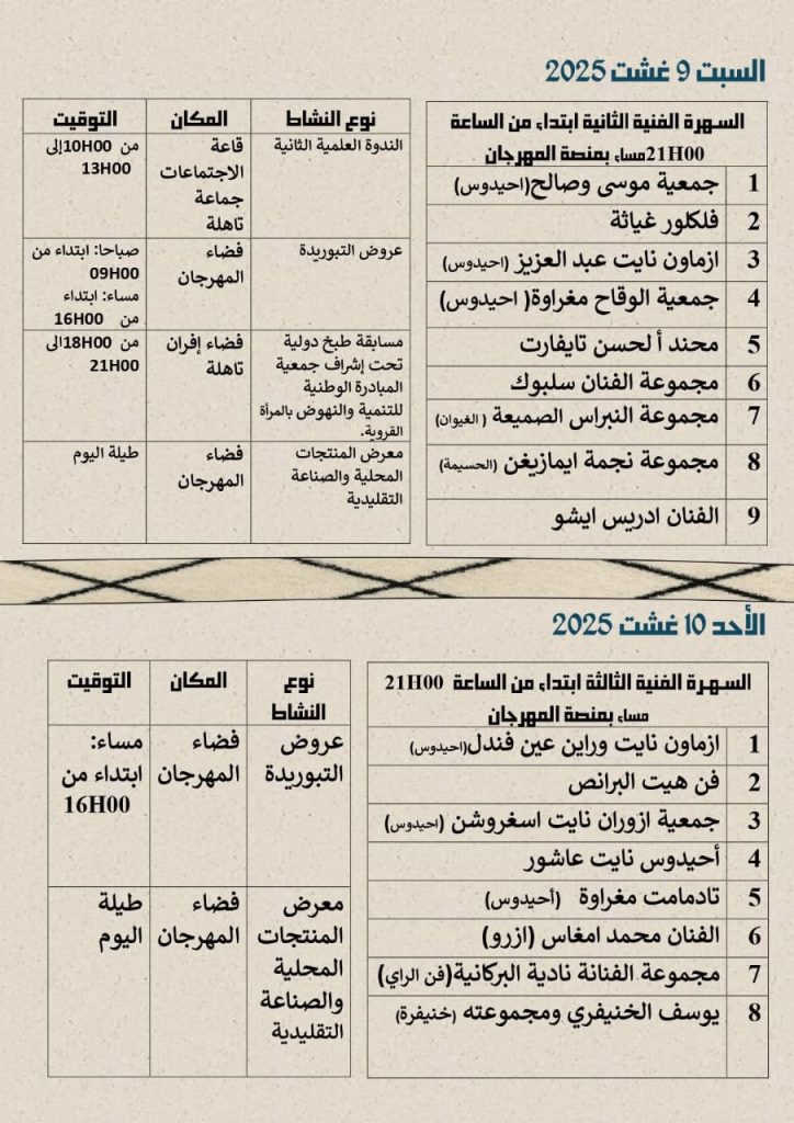 والأهمية هذا المهرجان ننشر برنامجه الكامل حتى يتسنى للجمهور تتبع فقراته المتنوعة ،فنية ،وثقافية وتراثية ، وفلكلورية ،ورياضية..