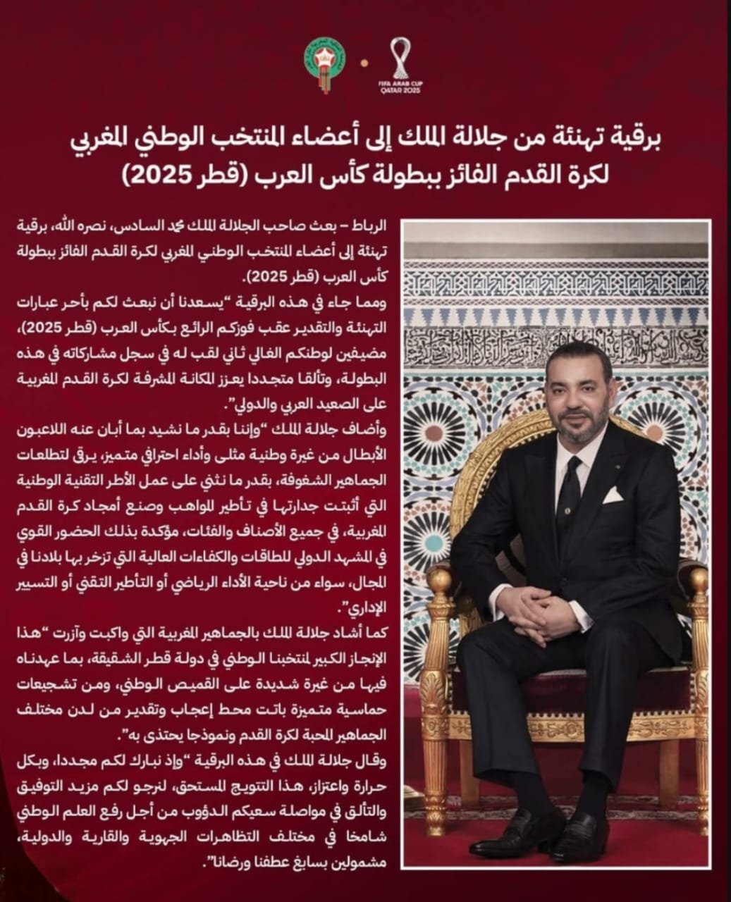 هنأ صاحب الجلالة الملك محمد السادس نصره المنتخب الوطني الرديف،بكل مكوناته ،والجمهور المغربي على دعمه وحضوره القوي وتشجيعه لعناصر النخبة الوطنية ، وذلك بعد احرازه بطولة كأس العرب في كرة القدم التي احتضنتها دولة قطر في الفترة ما بين فاتح و18دجنبر الجاري.
