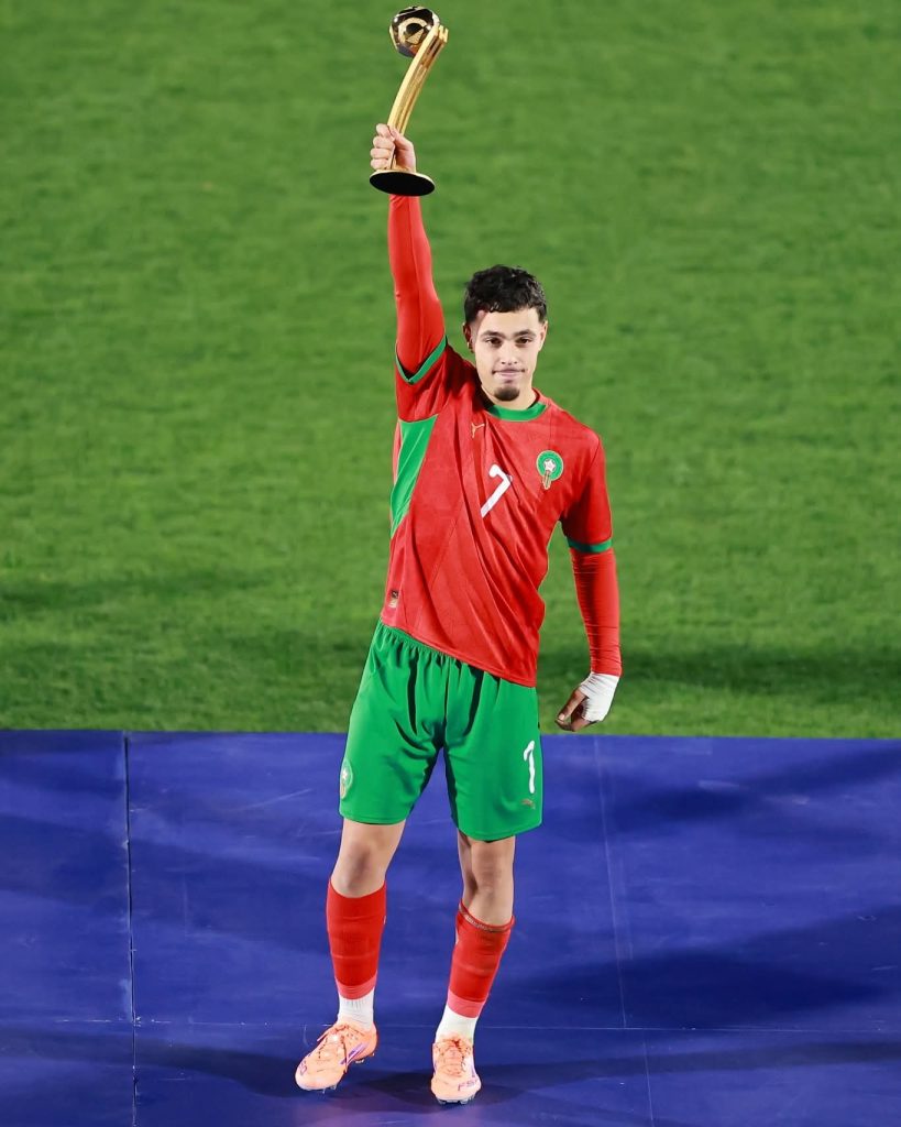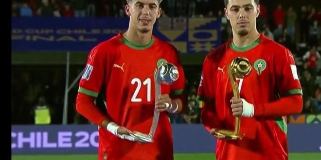 الرئيسية » رياضة » على هامش بطولة العالم لكرة القدم U20 بالشيلي 2025 : تتويج اللاعب الدولي المغربي ياسر الزبيري بجائزة هدّاف كأس العالم ،وعثمان معما بافضل لاعب في البطولة.