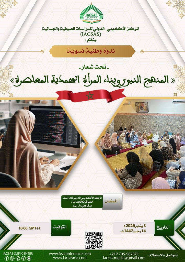 ينظم المركز الاكاديمي الدولي للدراسات الصوفية والجمالية ،ندوة وطنية نسويةهامة تروم ابراز مكانة المرأة في المنهج النبوي الشريف ،ودورها المحوري في بناء الانسان والمجتمع.