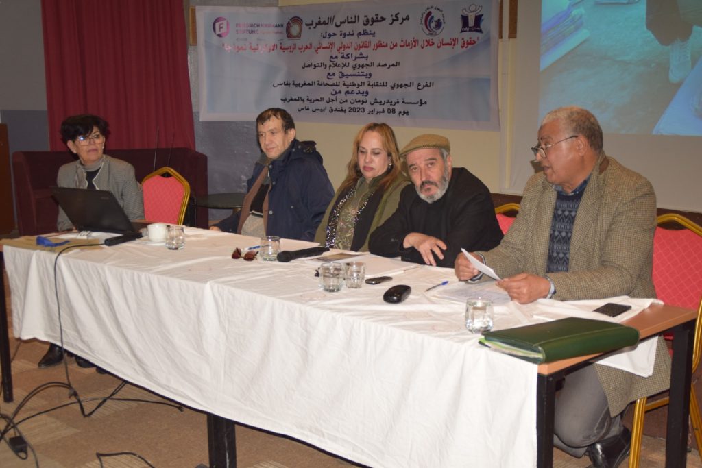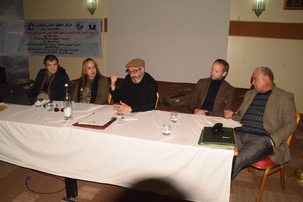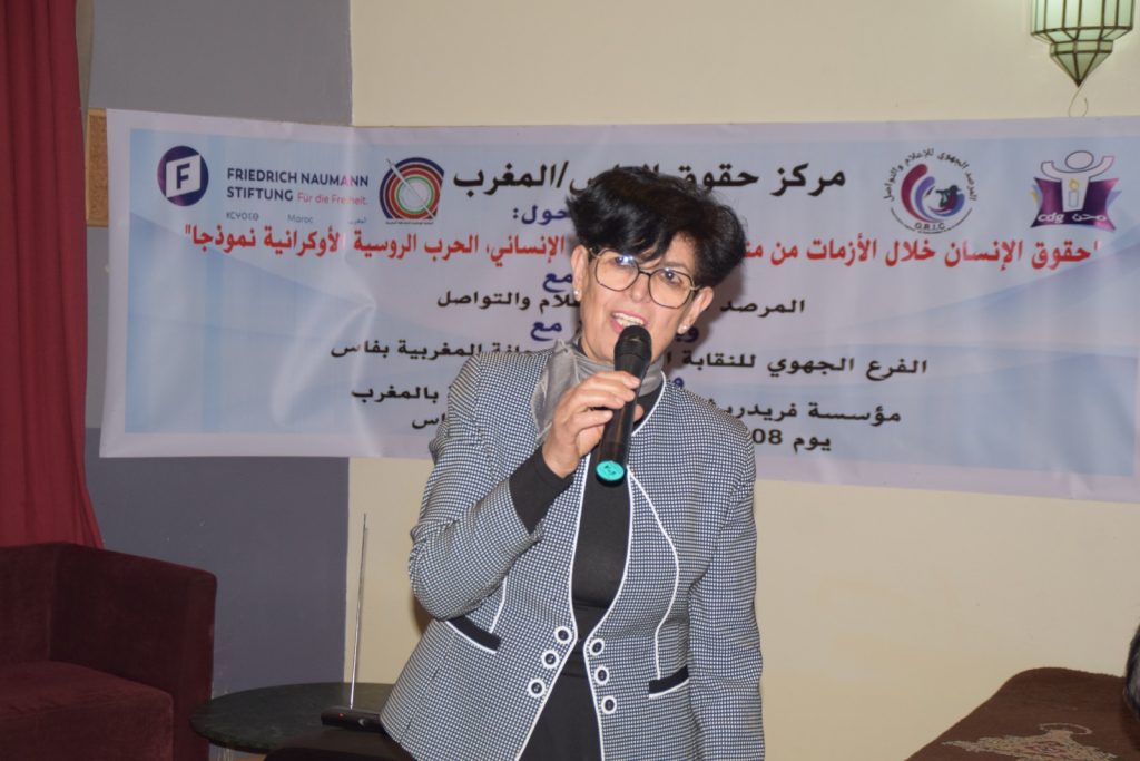 وتطرقت ا لا ستاذة أمينة مجدوب، عضو الهياة المديرة لمركز حقوق المغرب، إلى دور المجتمع المدني في مجال تعزيز حقوق الإنسان خلال الأزمات والحروب، واكدت على أهمية هذا الدور المتمثل في التحسيس، و الوقاية، إلى جانب المهام المتعددة التي تقوم بها المؤسسات الرسمية.