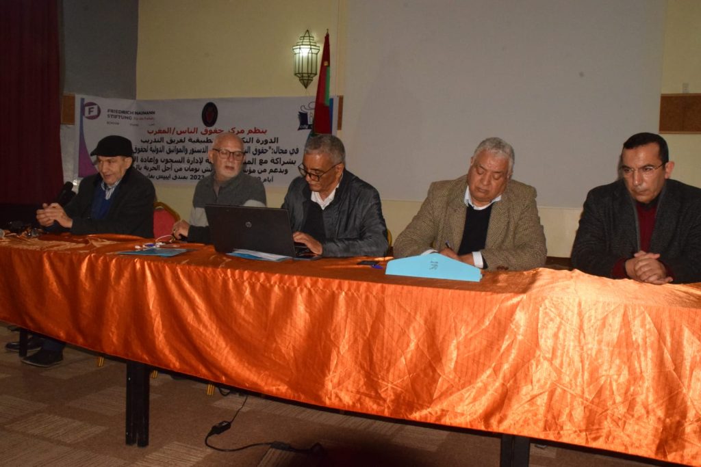 الدورة التكوينية التطبيقية لفريق التدريب ،عرفت عروضا نظرية ألقاها مختصون كل في مجال تخصصه على مدى ثلاثة أيام، منها :حقوق السجناء من خلال المواثيق الدولية لحقوق الانسان، مع مائدة مستديرة حول حقوق السجناء في ظل القانون الداخلي الدستور المغربي ،ومبادئ الرياض وقواعد بيكين ، وتمت مناقشة قانون السجون من خلال زوايا متعددة من أجل تفادي بعض الهنات الموجودة في هذا القانون.